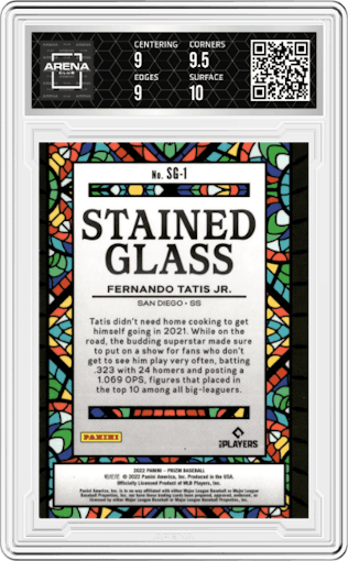 Fernando Tatis Jr.  from the 2022 Panini Prizm set graded by Arena Club and given an overall grade of 9.5.Fernando Tatis Jr.  from the 2022 Panini Prizm set graded by Arena Club and given an overall grade of 9.5.