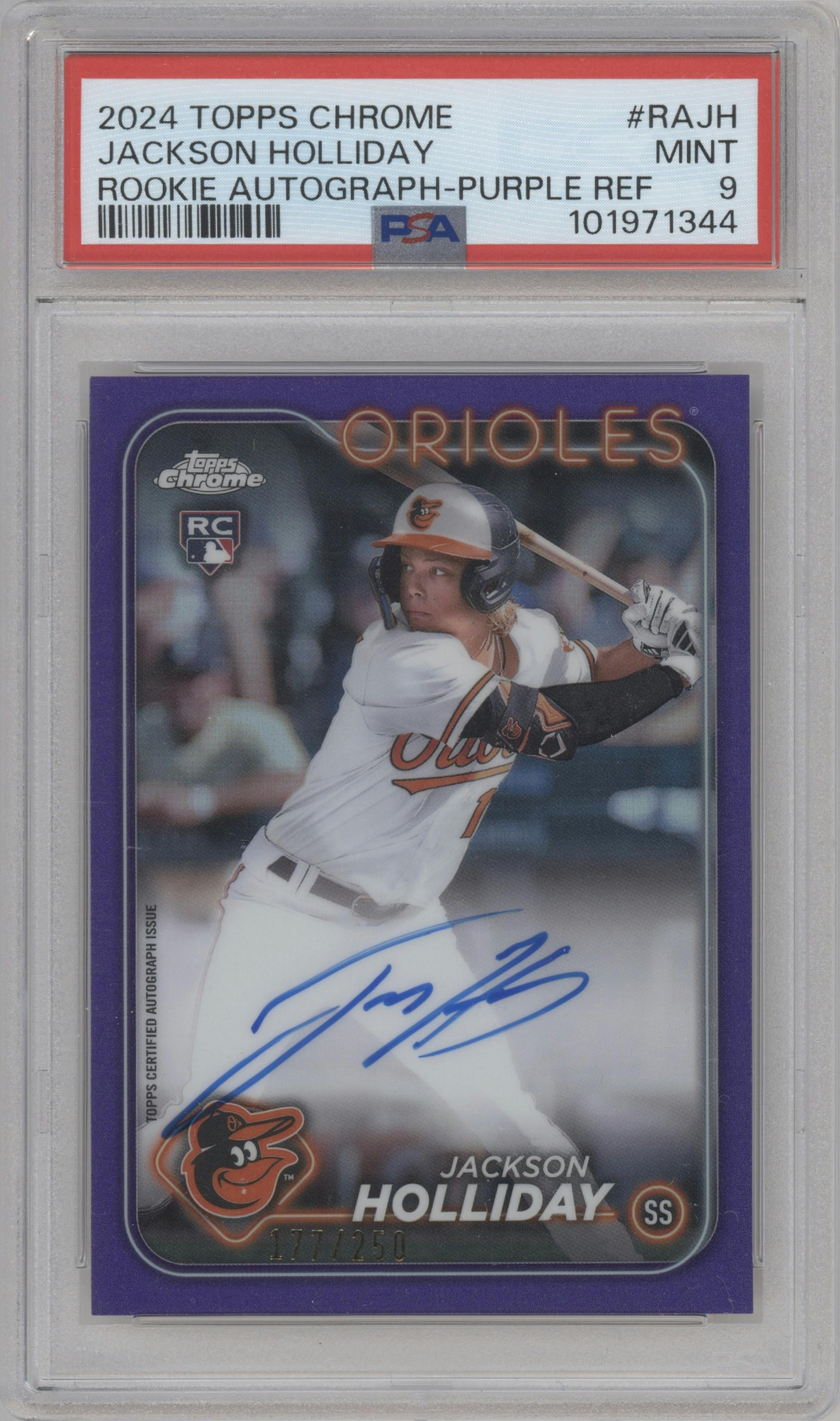 Jackson Holliday from the 2024 Topps Chrome set featuring a Purple Refractor parallel graded by PSA and given an overall grade of 9.