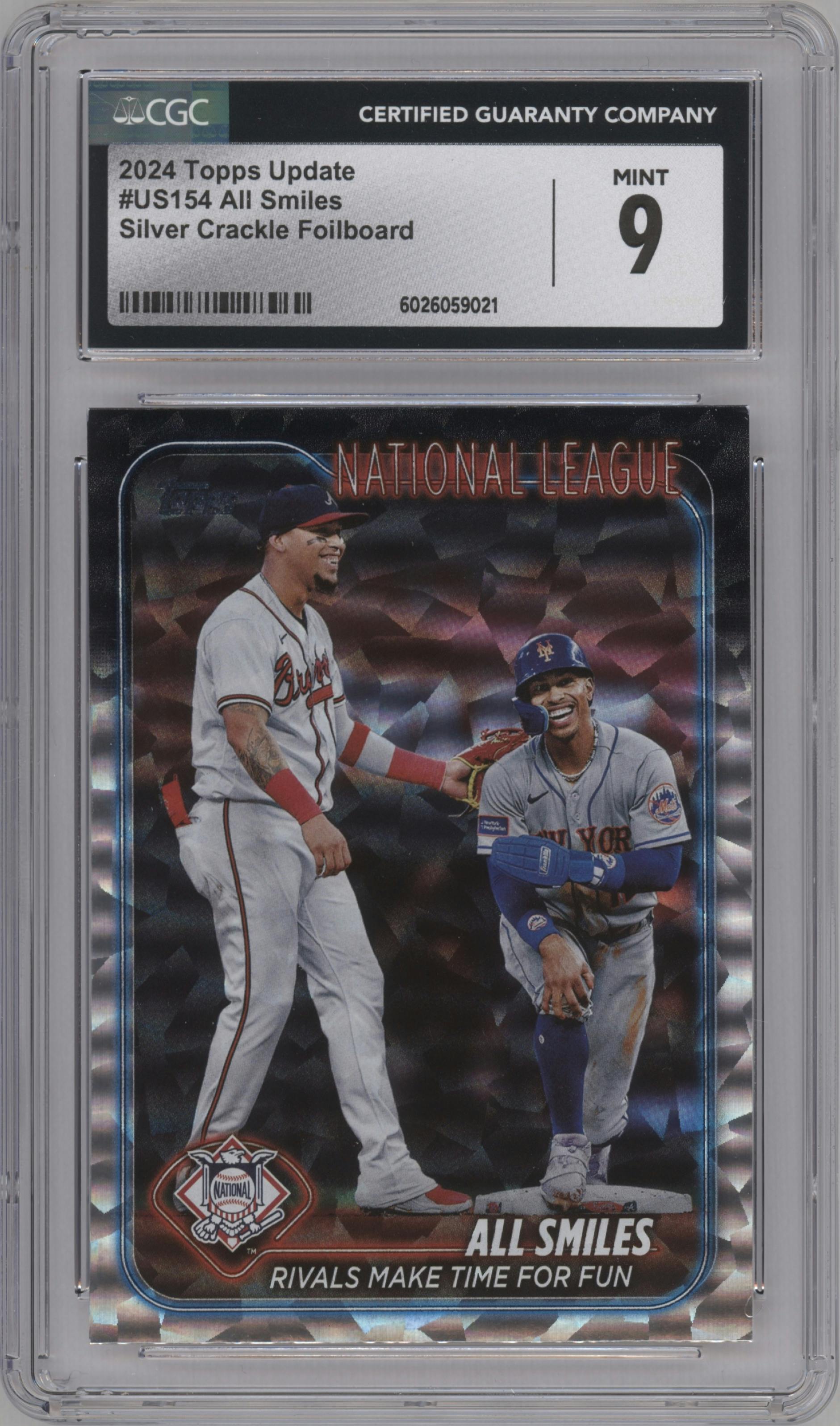 Orlando Arcia/Francisco Lindor from the 2024 Topps Update set featuring a Silver Crackle Foilboard parallel graded by CSG and given an overall grade of 9.