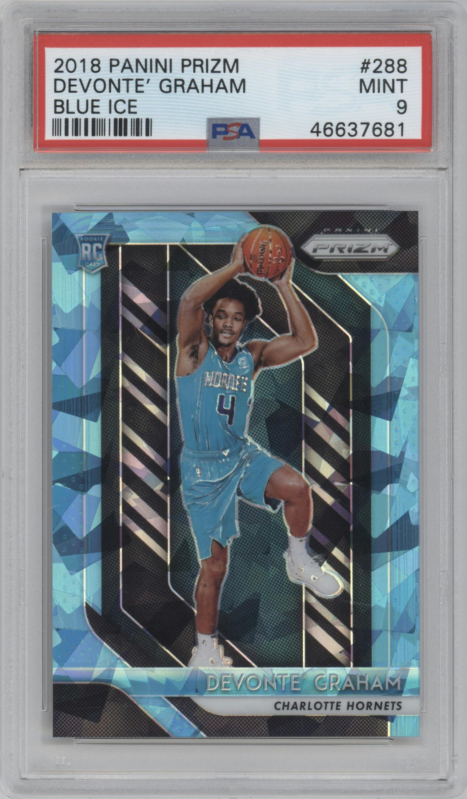 Devonte' Graham from the 2018-19 Panini Prizm set featuring a Blue Ice parallel graded by PSA and given an overall grade of 9.