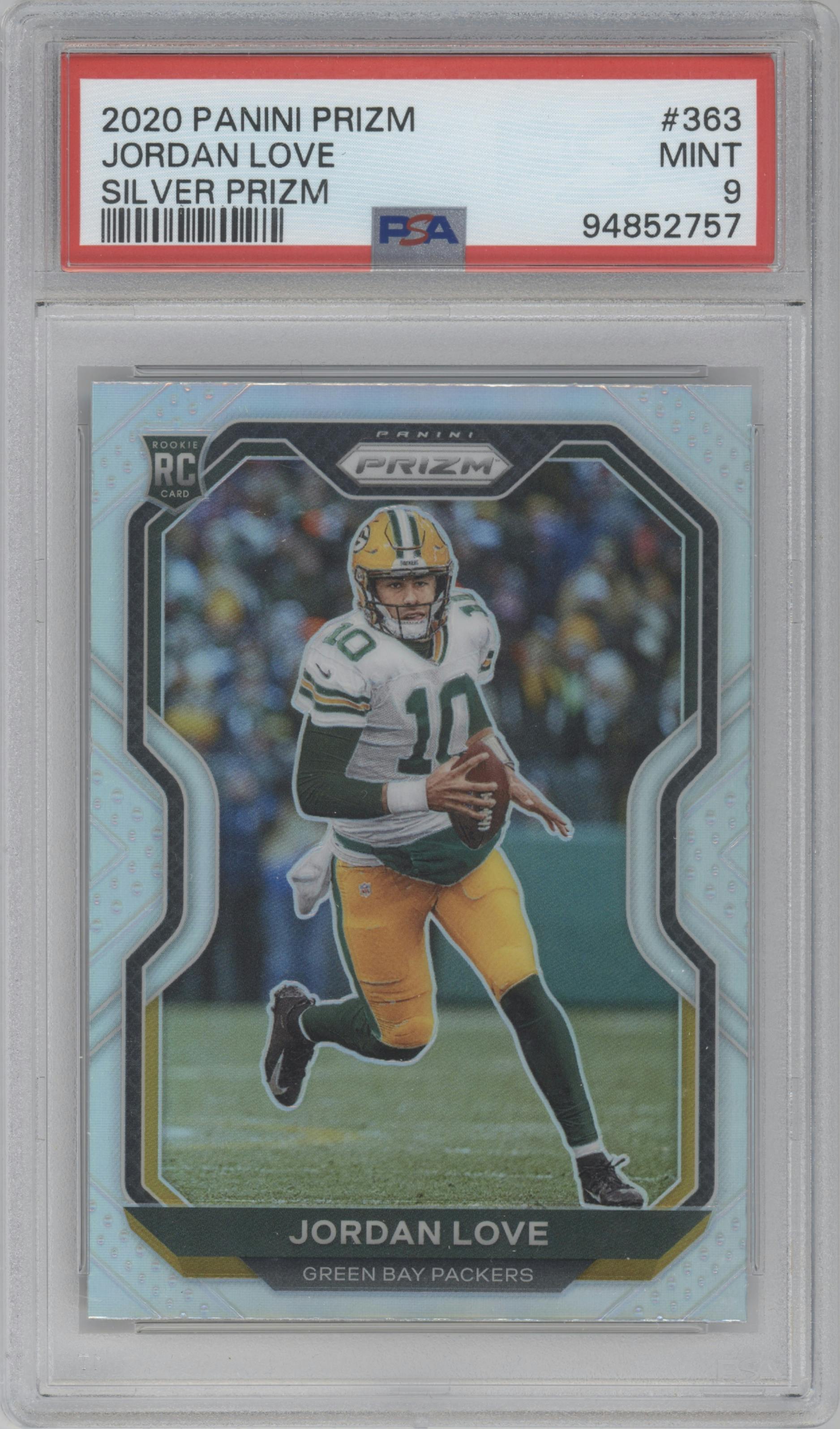 Jordan Love from the 2020 Panini Prizm set featuring a Silver Prizm parallel graded by PSA and given an overall grade of 9.