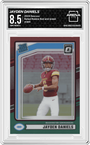 Jayden Daniels from the 2024 Donruss set featuring a Red and Green parallel graded by Arena Club and given an overall grade of 8.5.Jayden Daniels from the 2024 Donruss set featuring a Red and Green parallel graded by Arena Club and given an overall grade of 8.5.