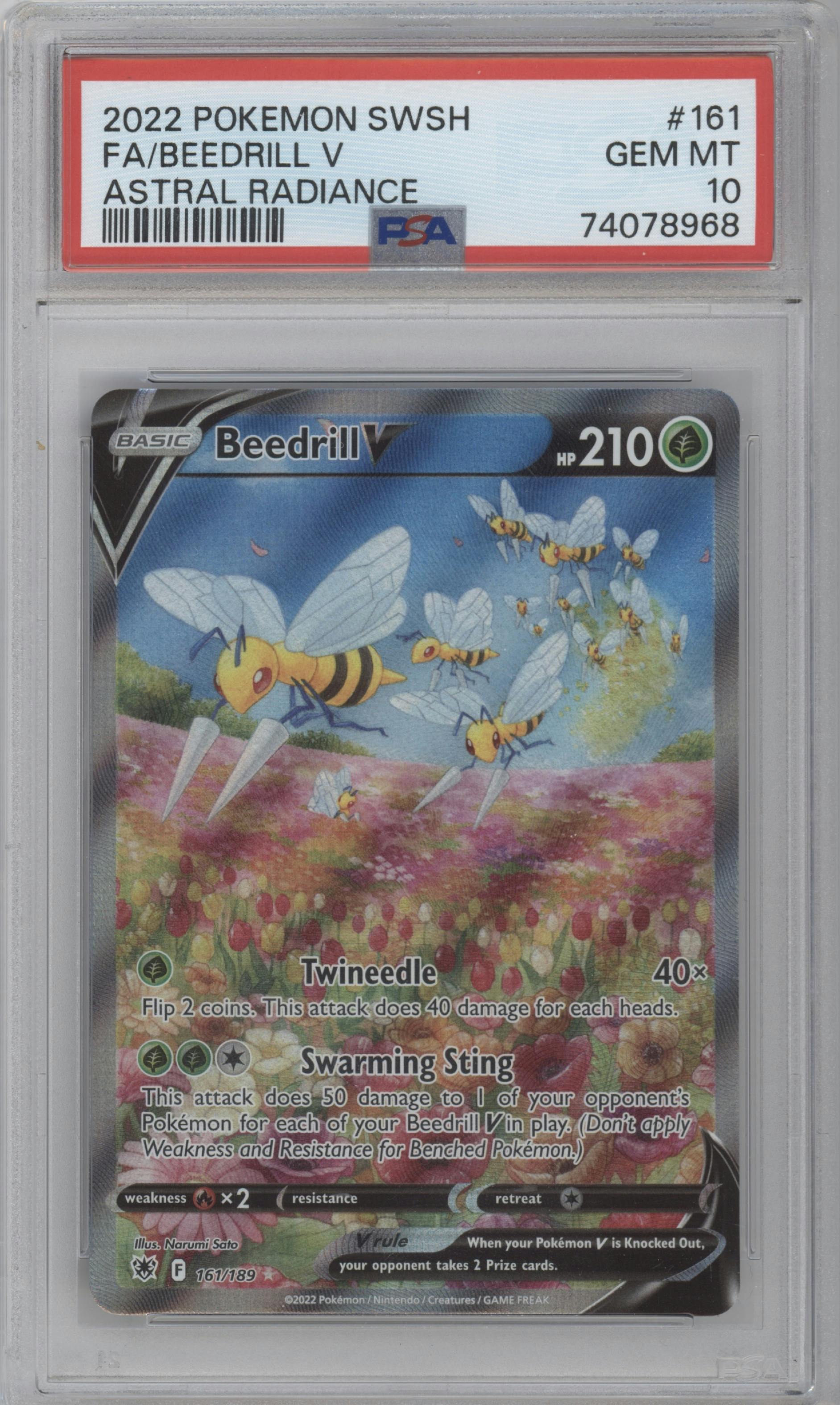 Beedrill V from the 2022 Pokemon SWSH set graded by PSA and given an overall grade of 10.